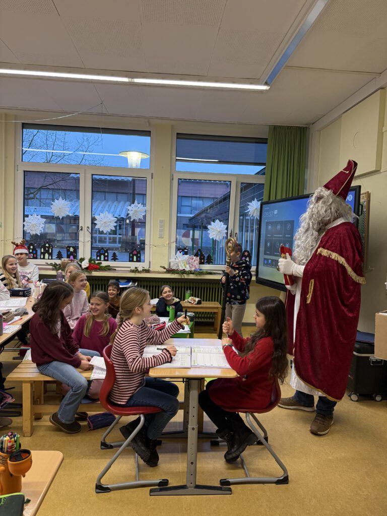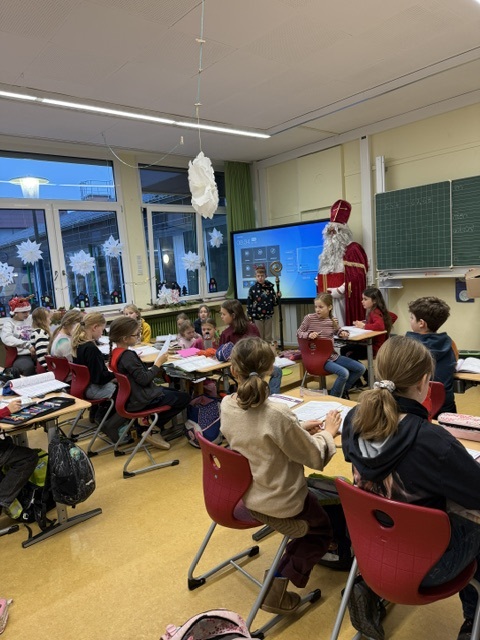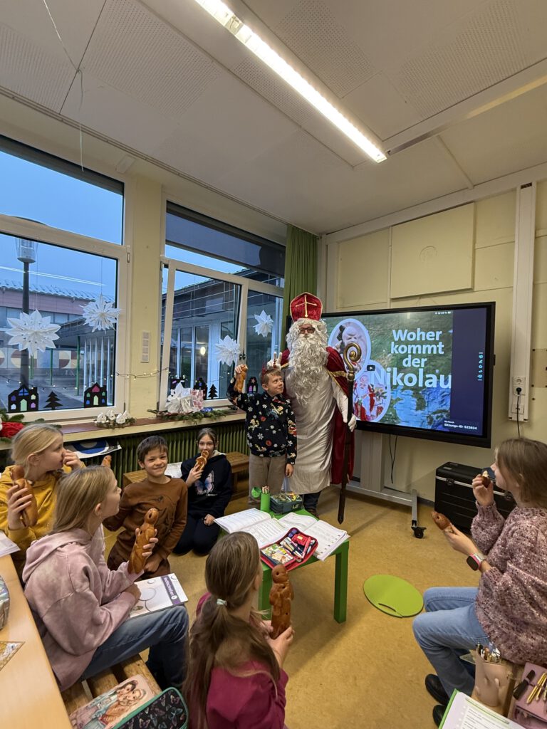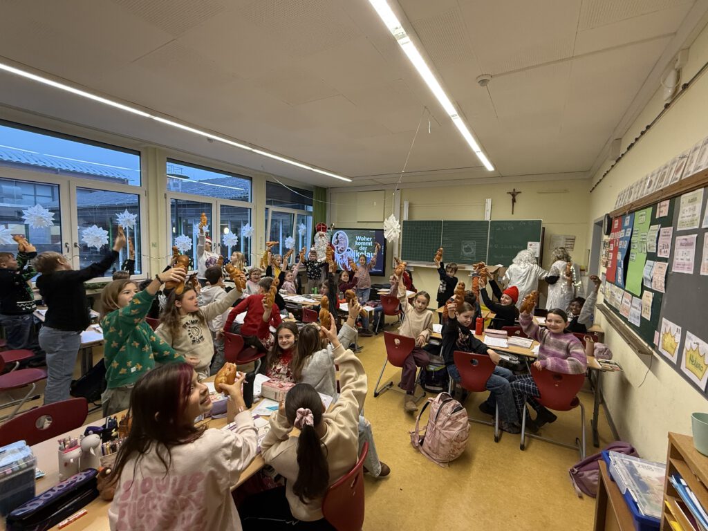 Dann gingen die Kinder in ihre Klassen und der Nikolaus besuchte sie dort und verteilte Weckmänner, die der Förderverein gespendet hat.